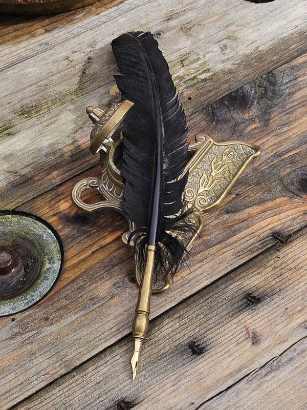 Encrier et support de plume en laiton. Vous pouvez changer la plume comme bon vous semble.